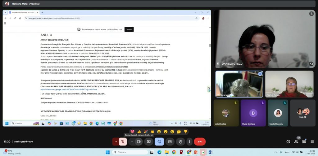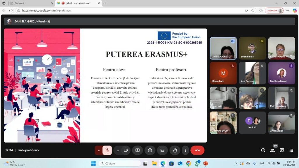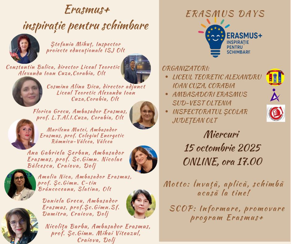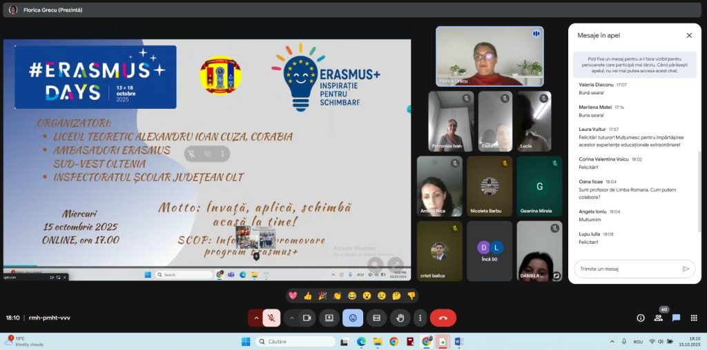 Zilele Erasmus Sud-Vest Oltenia! Si a fost ziua Erasmus….15.10.2025. Printre activitatile curente, am povestit, ne-am bucurat, am fost impreuna, profesori din tara si din afara ei. Invitate profesoarele care predau Limba Cultura si Civilizatie Română în Spania prin Institutul Limbii Române: Lolica Lucica Loliceru, Petronela Ivan, Cristina Stoica.